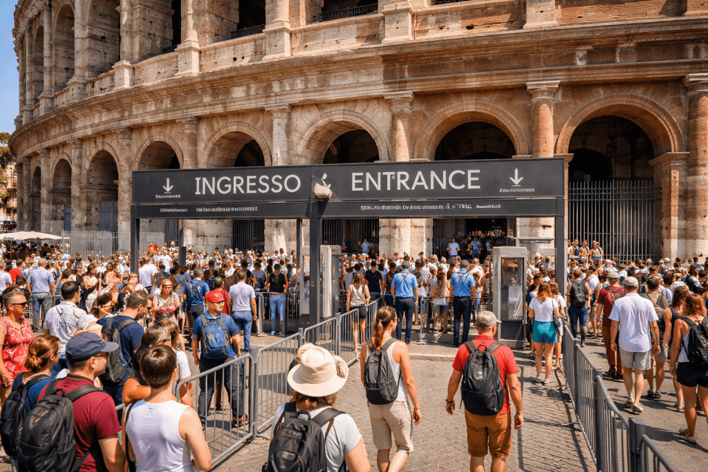 Gli ingressi per i tour guidati al Colosseo differiscono significativamente dagli ingressi per l’ammissione generale per facilitare le visite organizzate. I gruppi in tour entrano tipicamente attraverso un varco dedicato vicino al lato nord-ovest, che è monitorato separatamente dalla fila per l’ammissione generale. Questa disposizione aiuta a mantenere la coesione del gruppo e consente alle guide di fornire un contesto immediato prima di entrare nel monumento.